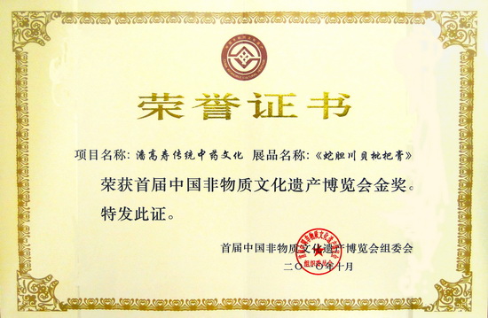 潘高壽傳統(tǒng)中藥文化,作為國(guó)家級(jí)非物質(zhì)文化遺產(chǎn)項(xiàng)目,代表廣東參加了首屆中國(guó)非物質(zhì)文化遺產(chǎn)博覽會(huì)。本屆博覽會(huì)是我國(guó)首次舉辦的非物質(zhì)文化遺產(chǎn)綜合性展會(huì),是全國(guó)非遺領(lǐng)域的一件盛事,是一屆圓滿成功、主題鮮明、內(nèi)容精彩、探索創(chuàng)新的博覽會(huì)。博覽會(huì)的“展品獎(jiǎng)”分金獎(jiǎng)、銀獎(jiǎng)和銅獎(jiǎng)。潘高壽“蛇膽川貝枇杷膏”、北京雕漆技藝“剔紅聽濤圖”中堂掛屏等37件作品榮獲金獎(jiǎng),山東魯繡發(fā)絲繡“鵲華秋色”、新疆維吾爾族樂(lè)器制作技藝“卡龍”等84件作品榮獲銀獎(jiǎng),西藏藏香制作技藝“直貢藏香”等69件作品榮獲銅獎(jiǎng)。