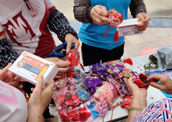 農歷五月初五是中國的傳統節日——端午節,有掛菖蒲、賽龍舟、吃粽子、飲雄黃、佩香囊等節日習俗,為了增進市民群眾對中國傳統節日文化的了解,充分感受這個節日所蘊含的民族情懷,營銷黨支部三個在營銷一線的黨小組帶領潘高壽綠肺基金的志愿者們走進社區,攜手戰略合作連鎖藥店的藥師,手把手教導市民如何制作防疫香囊,體驗傳統中醫藥文化的魅力。